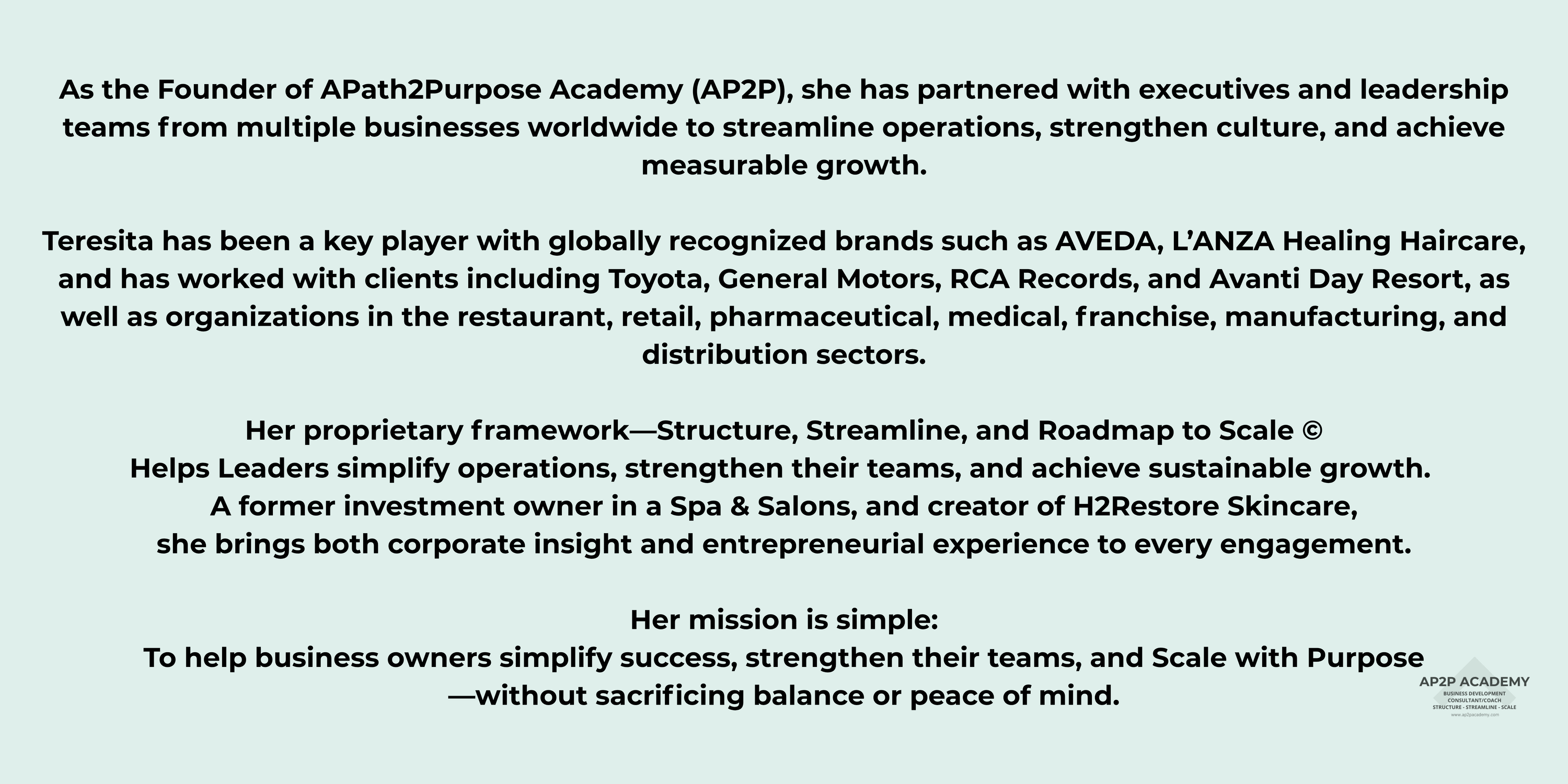 At APath2Purpose Academy (AP2P), I work with business owners, executives, and management teams to build Growth Driven Business Systems through my proven 3-pillar framework: